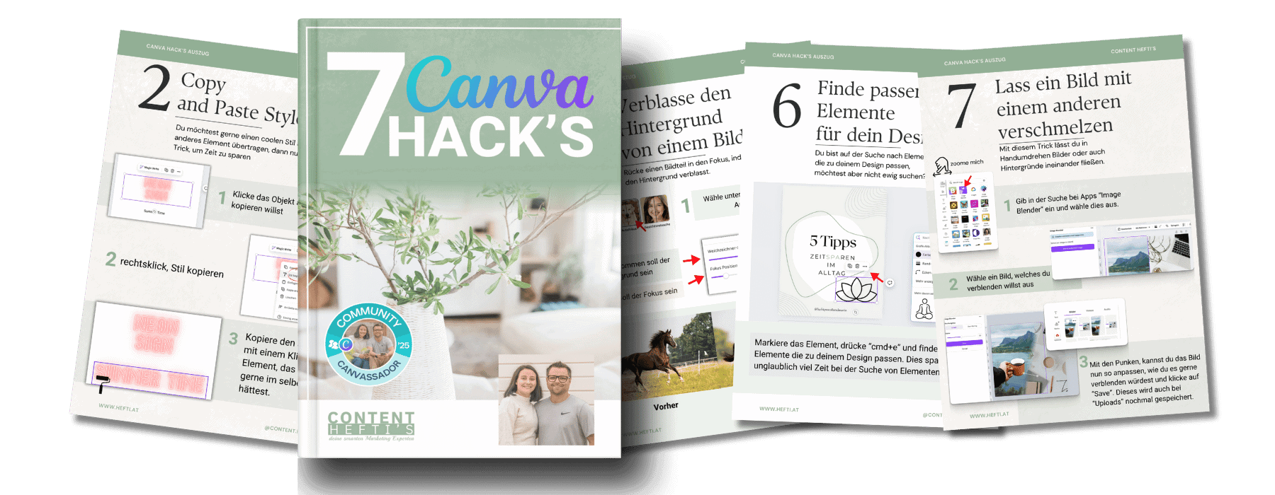 Hol dir jetzt die 7 Canva-Hacks und spare Zeit, erziele Wow-Effekte und erstell Designs, die Kunden lieben! Bereits mehr als 3.000 Downloads.