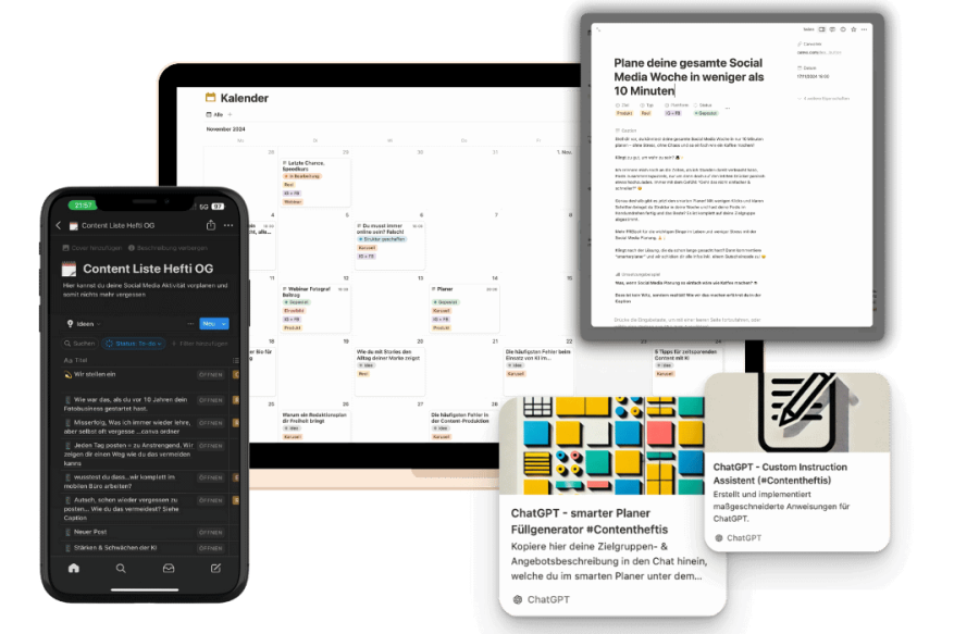 Der smarte Planer bietet eine zentrale Plattform, um deine Content-Ideen zu sammeln, zu organisieren und zu planen. Mit der integrierten Zielgruppenanalyse sowie den maßgeschneiderten Content-Ideen von ChatGPT kannst du eine durchdachte und effektive Content-Strategie entwickeln und umsetzen, welche genau auf deine Zielgruppe abgestimmt ist.
