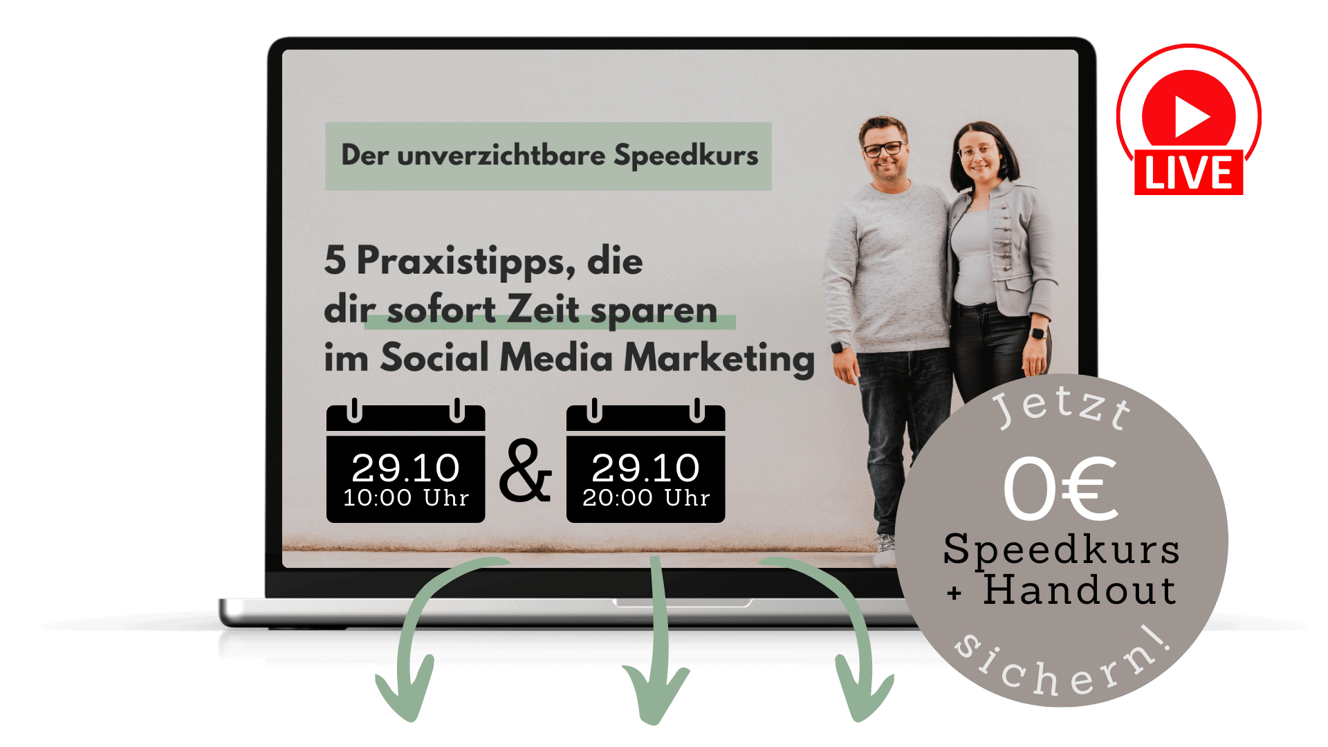 Die Speedkurs ist ein bis zu 90-minütiger Online-Webinar, der dir zeigt, wie du schnell und effizient hochwertigen Content für deine Social Media Kanäle erstellen kannst.